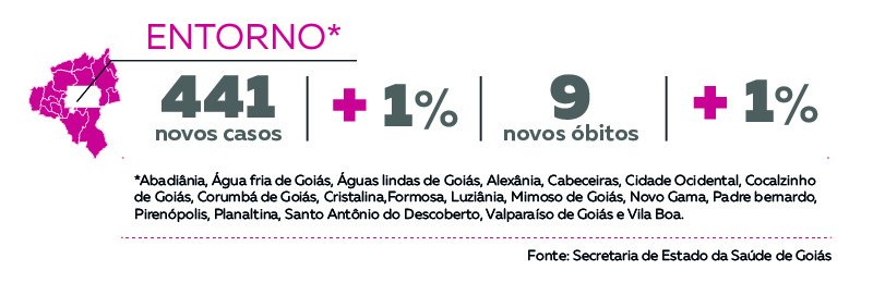 A região do Entorno de Brasília apresentou um percentual de crescimento abaixo da média estadual. Em uma semana, o número de casos de coronavírus saiu de 33.194 para 33.635, o que representa um aumento de 1,3%. O percentual apurado é menor do que o registrado na semana anterior, de 3,3%. Foram confirmadas também 9 mortes na semana, um crescimento 1,2%.