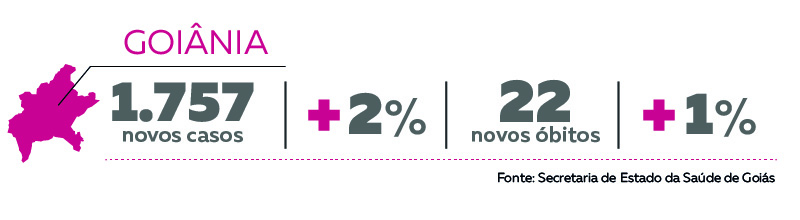Em Goiânia foram confirmados 1.757 novos casos em uma semana, o que representa um aumento de 2,6%. Na semana anterior, o crescimento foi de 2,4%. O número de mortes na cidade saiu de 1.731 para 1.753, um acréscimo de 1,3%. O aumento foi menor do que na semana passada (3,3%).