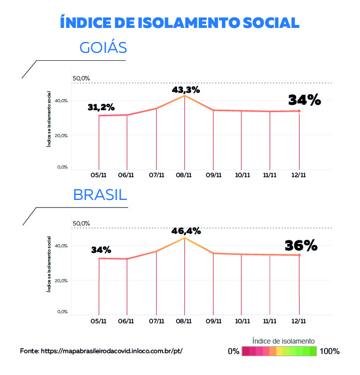 O índice de isolamento social em Goiás aumentou nesta semana, saindo de 31,3% para 34%, de acordo com o monitoramento da empresa de georreferenciamento In Loco. O estado possui o segundo pior índice de isolamento social do País, perdendo apenas para o Tocantins (31,1%). A média nacional é de 36% e o recomendado pelas autoridades de saúde é de 70%.