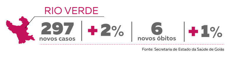 O município de Rio Verde, no Sudoeste do estado, tem o quarto maior número de casos confirmados da doença. Até quinta (12), foram 13.251 registros de Covid-19 na cidade. Em uma semana, o crescimento foi de 2,3%. Este percentual foi menor do que o apurado na semana anterior, quando foi registrado um crescimento de 0,7%.