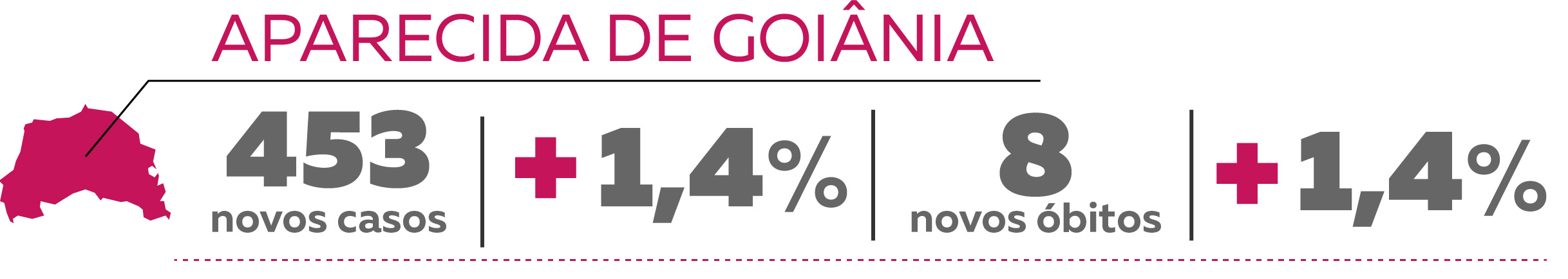 Em Aparecida de Goiânia foram confirmados 453 novos casos da doença em uma semana, um crescimento de 1,2%. Na semana passada o aumento foi de 3,1%. O total de casos agora é de 39.124. Foram registrados também 8 novos óbitos no município, um crescimento de 1,4%. No período anterior, o aumento foi de 1,6%.