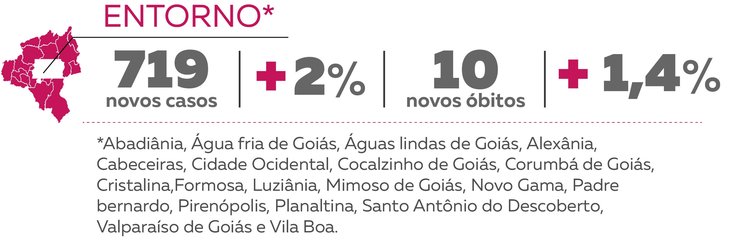 O maior número de casos foi registrado em Valparaíso de Goiás. Lá foram confirmados 126 casos em uma semana e o total agora é de 7.879. Em seguida vem Luziânia (6.824), Águas Lindas de Goiás (4.337), Cidade Ocidental (3.856) e Formosa (3.651). Entre as 19 cidades da microrregião, apenas Água Fria de Goiás não registrou nenhum óbito. A cidade de Luziânia tem o maior número de mortes, com 139 confirmações.
