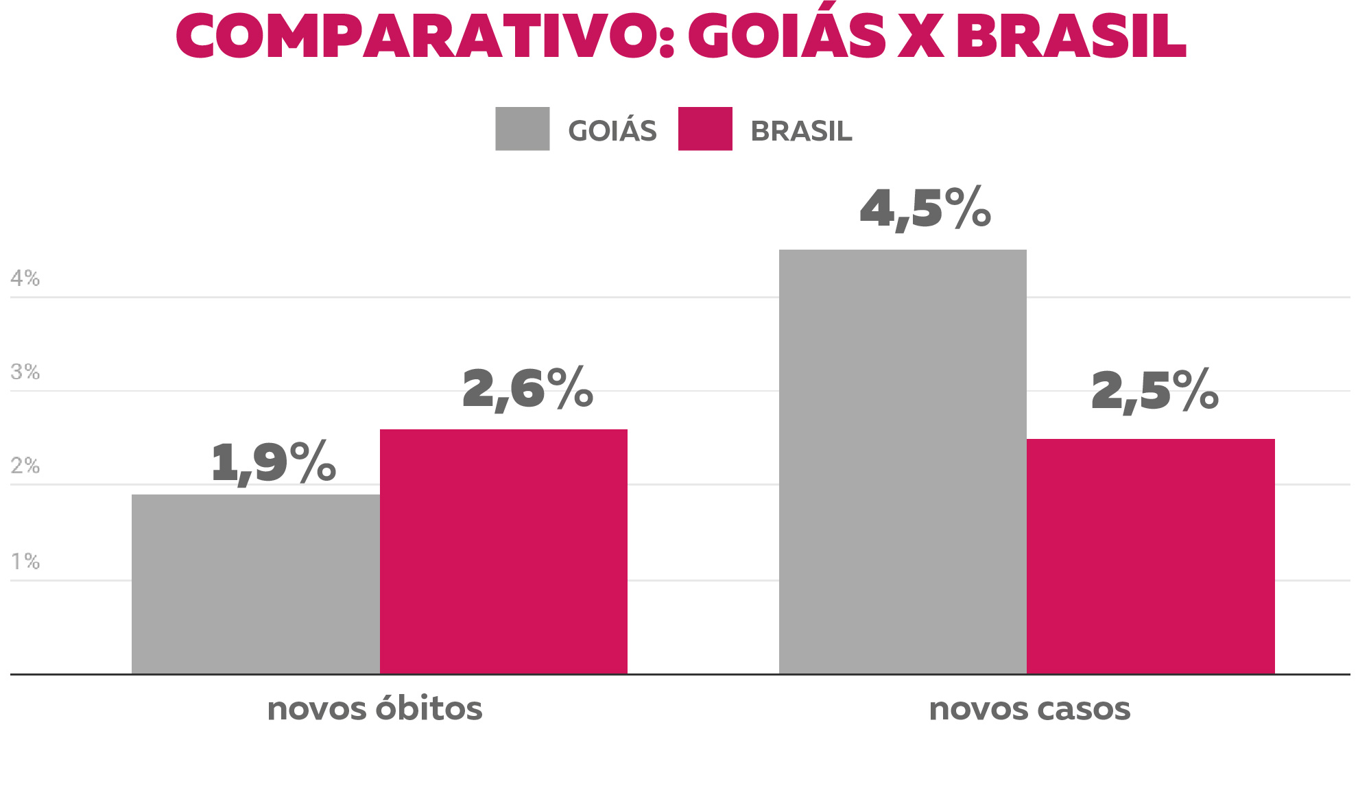 Os dados também mostram que o número de óbitos cresceu proporcionalmente abaixo da média nacional. Em todo o país, o número de mortes confirmadas pelo coronavírus subiu 2,6% no período, chegando a 179.765 mortes, de acordo com o Ministério da Saúde. Já o número de casos confirmados aumentou 4,5% e chegou a 6.781.799. A taxa de letalidade no estado de Goiás (2,3%) é menor do que a média brasileira (2,7%).