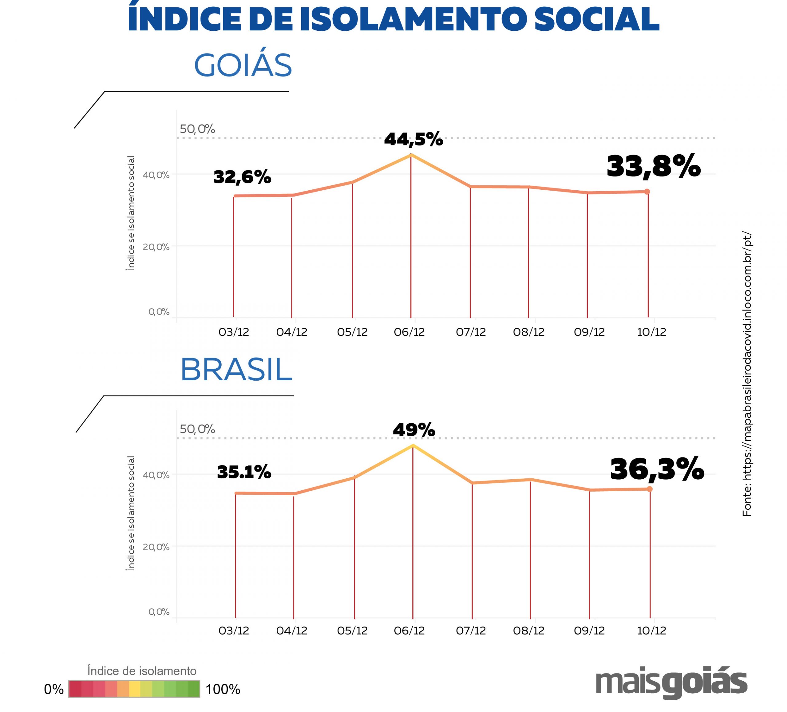 O índice de isolamento social em Goiás aumentar nesta semana, saindo de 32,5% para 33,8% de acordo com o monitoramento da empresa de georreferenciamento In Loco. O estado possui o segundo pior índice de isolamento social do País, atrás apenas do Tocantins (32,4%). A média nacional é de 36,3% e o recomendado pelas autoridades de saúde é de 70%.