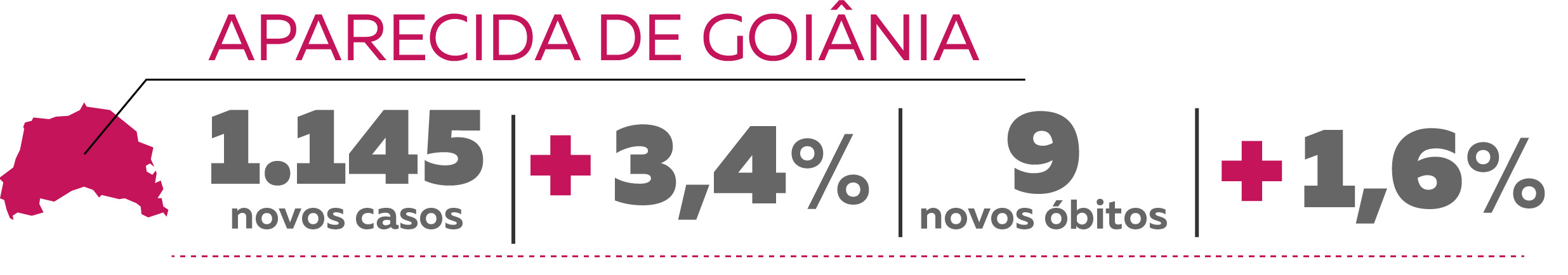 Em Aparecida de Goiânia foram confirmados 172 novos casos da doença em uma semana, um crescimento de 3,1%. Na semana passada o aumento foi de 0,4%. O total de casos agora é de 38.671. Foram registrados também 9 novos óbitos no município, um crescimento de 1,6%. No período anterior, o aumento foi de 1,4%