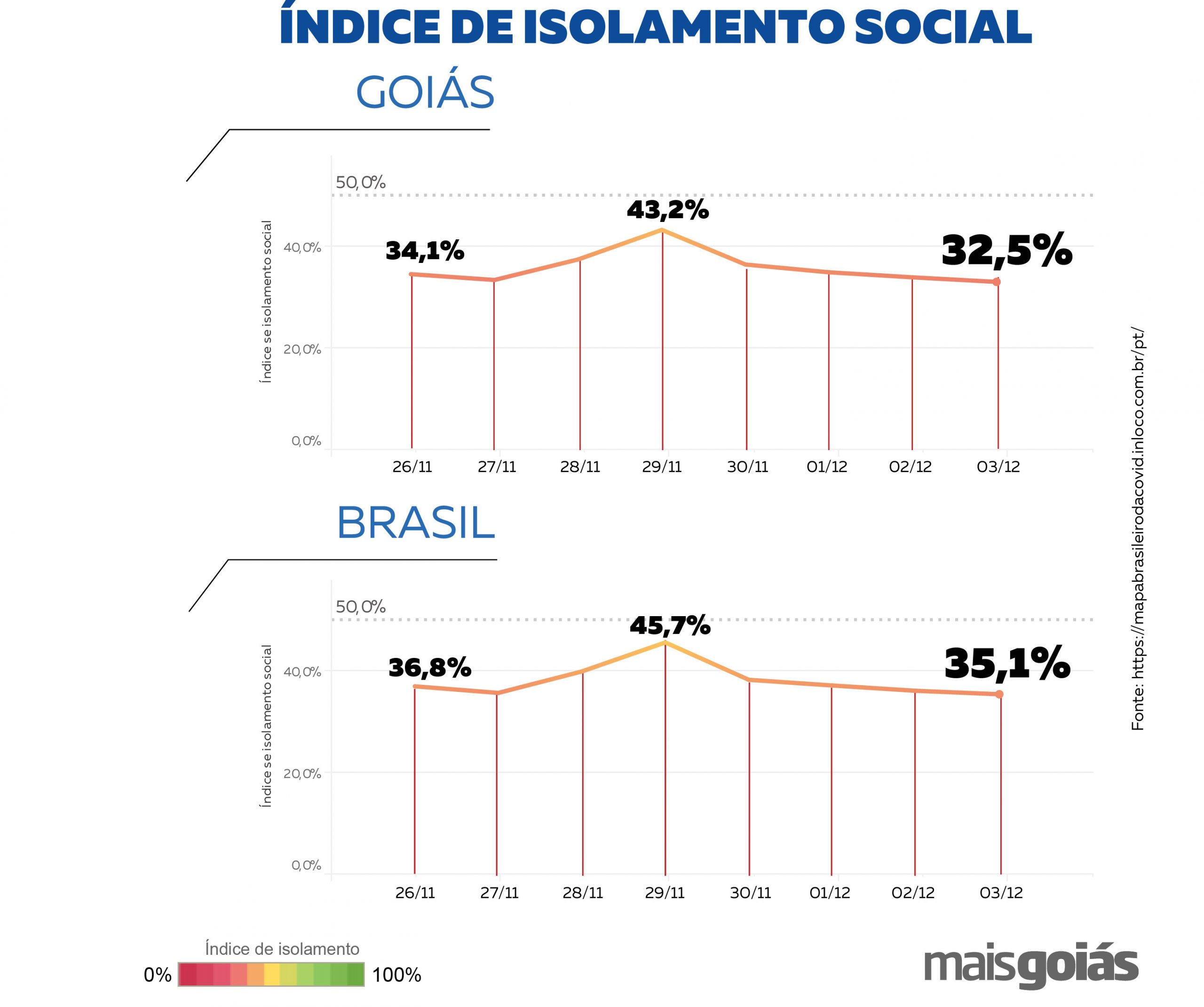 O índice de isolamento social em Goiás caiu nesta semana, saindo de 37,2% para 32,5% de acordo com o monitoramento da empresa de georreferenciamento In Loco. O estado possui o segundo pior índice de isolamento social do País, atrás apenas do Tocantins (31,2%). A média nacional é de 37,4% e o recomendado pelas autoridades de saúde é de 70%.