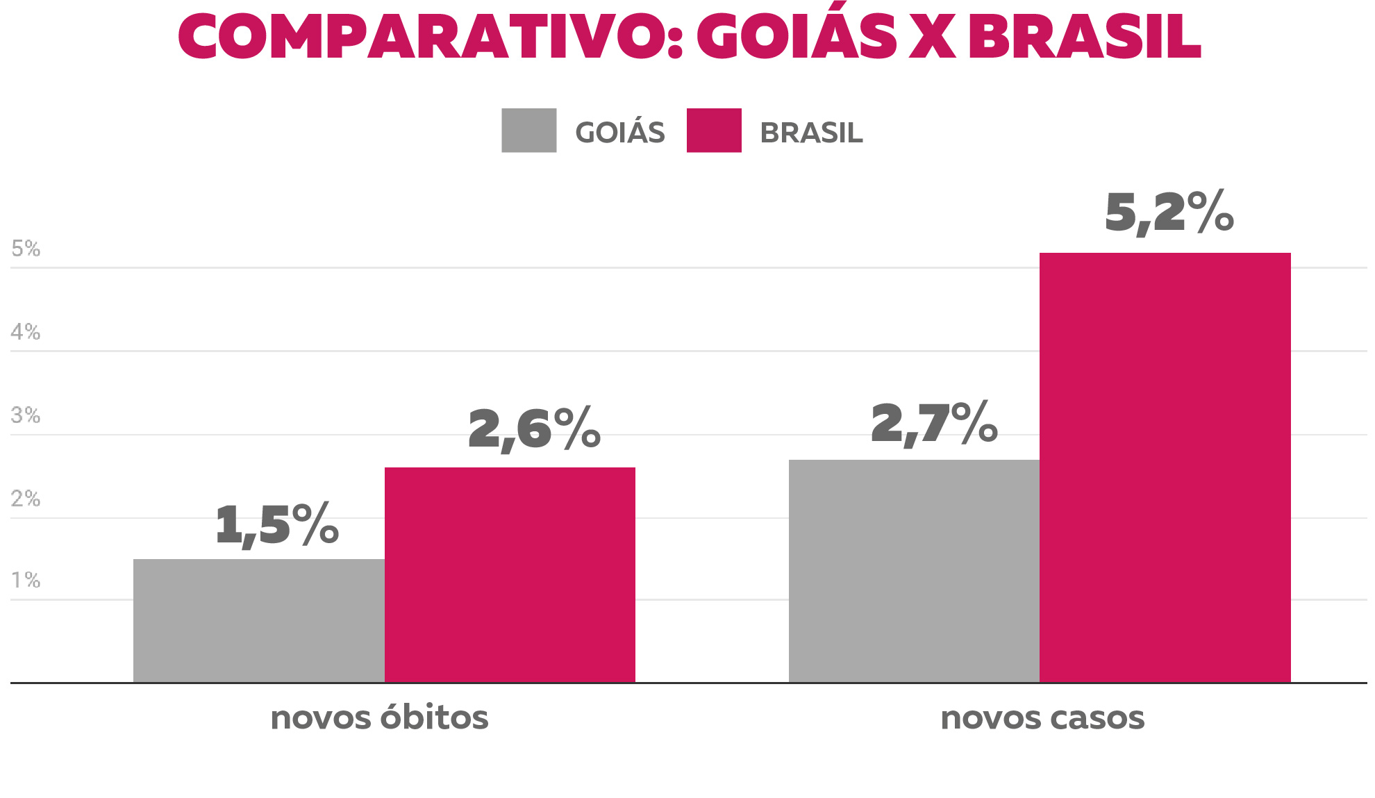 Os dados também mostram que o número de óbitos cresceu proporcionalmente abaixo da média nacional. Em todo o país, o número de mortes confirmadas pelo coronavírus subiu 2,6% no período, chegando a 175.270 mortes, de acordo com o Ministério da Saúde. Já o número de casos confirmados aumentou 5,2% e chegou a 6.487.084. A taxa de letalidade no estado de Goiás (2,3%) é menor do que a média brasileira (2,7%).