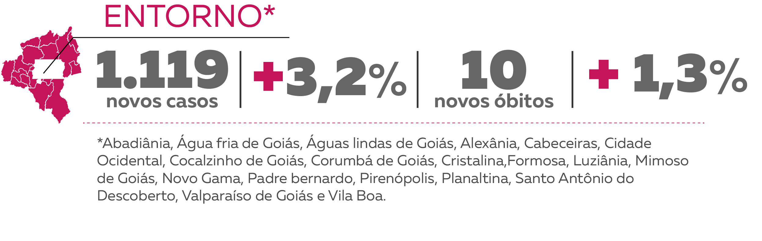 O maior número de casos foi registrado em Valparaíso de Goiás. Lá foram confirmados 142 casos em uma semana e o total agora é de 7.753. Em seguida vem Luziânia (6.691), Águas Lindas de Goiás (4.273), Cidade Ocidental (3.786) e Formosa (3.553). Entre as 19 cidades da microrregião, apenas Água Fria de Goiás não registrou nenhum óbito. A cidade de Luziânia tem o maior número de mortes, com 139 confirmações.