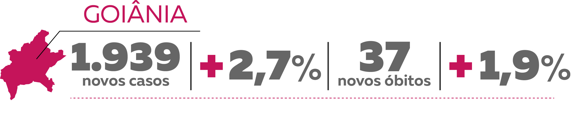 Em Goiânia foram confirmados 1.939 novos casos em uma semana, o que representa um aumento de 2,7%. Na semana anterior, o crescimento foi de 1,8%. O número de mortes na cidade saiu de 1.910 para 1.947, um acréscimo de 1,9%, mesmo aumento registrado na semana passada.