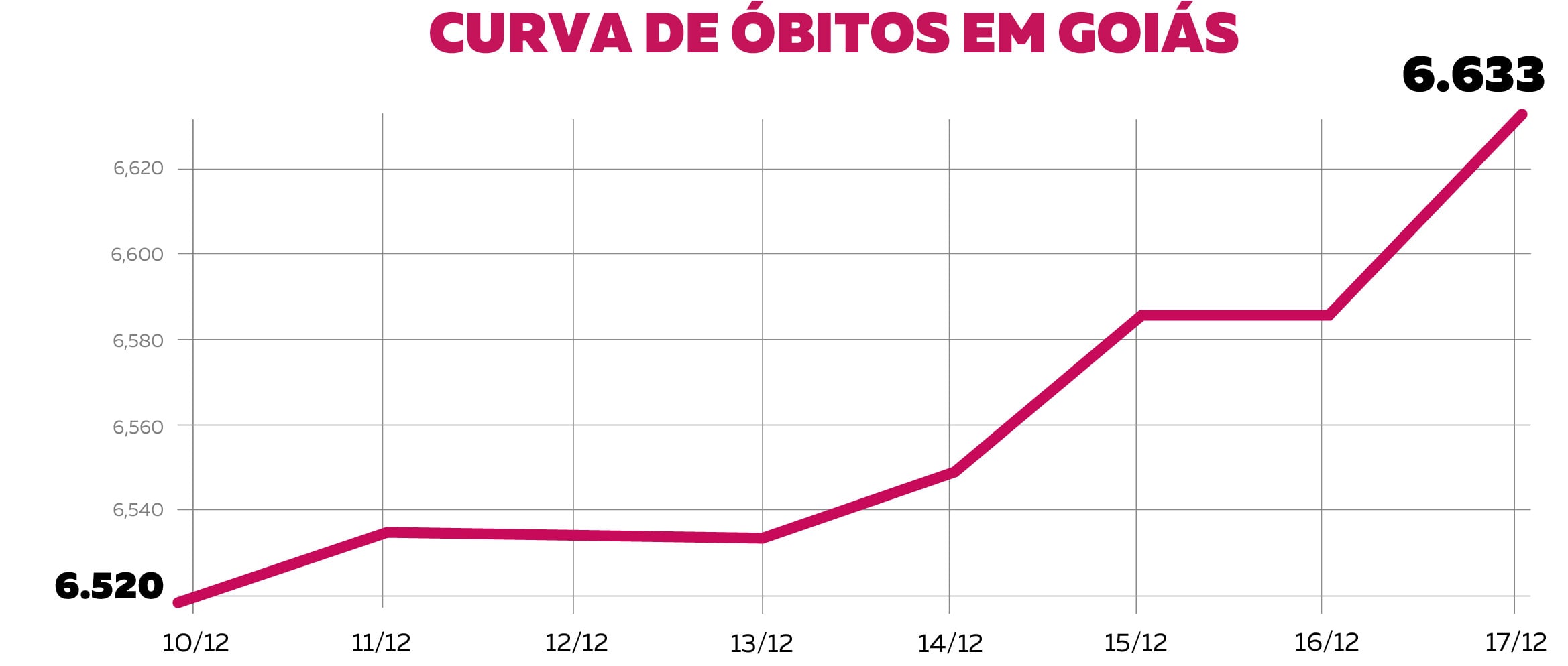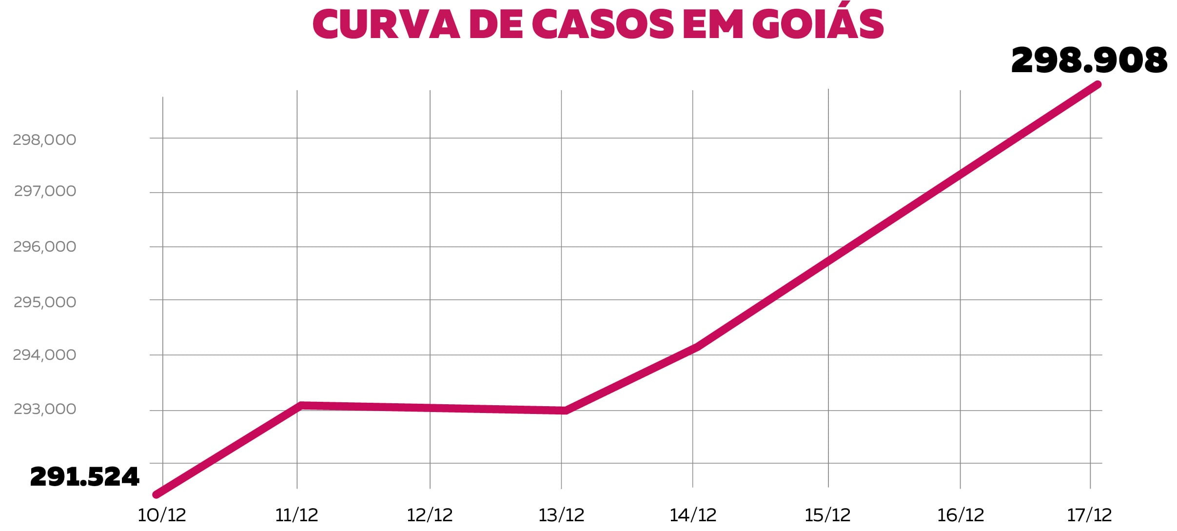 Os números mostram que o aumento de casos é proporcionalmente o mesmo da semana passada. No último levantamento semanal feito pelo Mais Goiás, que apurou os dados registrados entre os dias 3 e 10 de dezembro, o crescimento foi de 2,5%. A alta, entretanto, é menor do que o apurado entre os dias 19 e 26 de novembro, que registrou 2,7%.