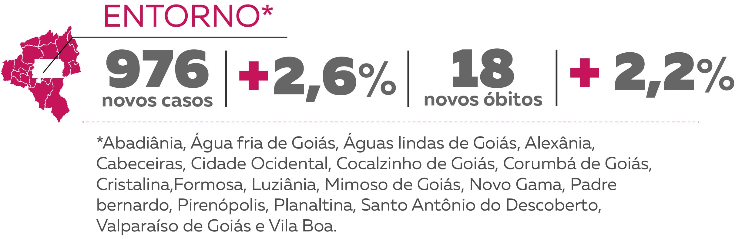 O maior número de casos foi registrado em Valparaíso de Goiás. Lá foram confirmados 102 casos em uma semana e o total agora é de 7.981. Em seguida vem Luziânia (7.063), Águas Lindas de Goiás (4.515), Cidade Ocidental (3.893) e Formosa (3.737). Entre as 19 cidades da microrregião, apenas Água Fria de Goiás não registrou nenhum óbito. A cidade de Luziânia tem o maior número de mortes, com 142 confirmações.