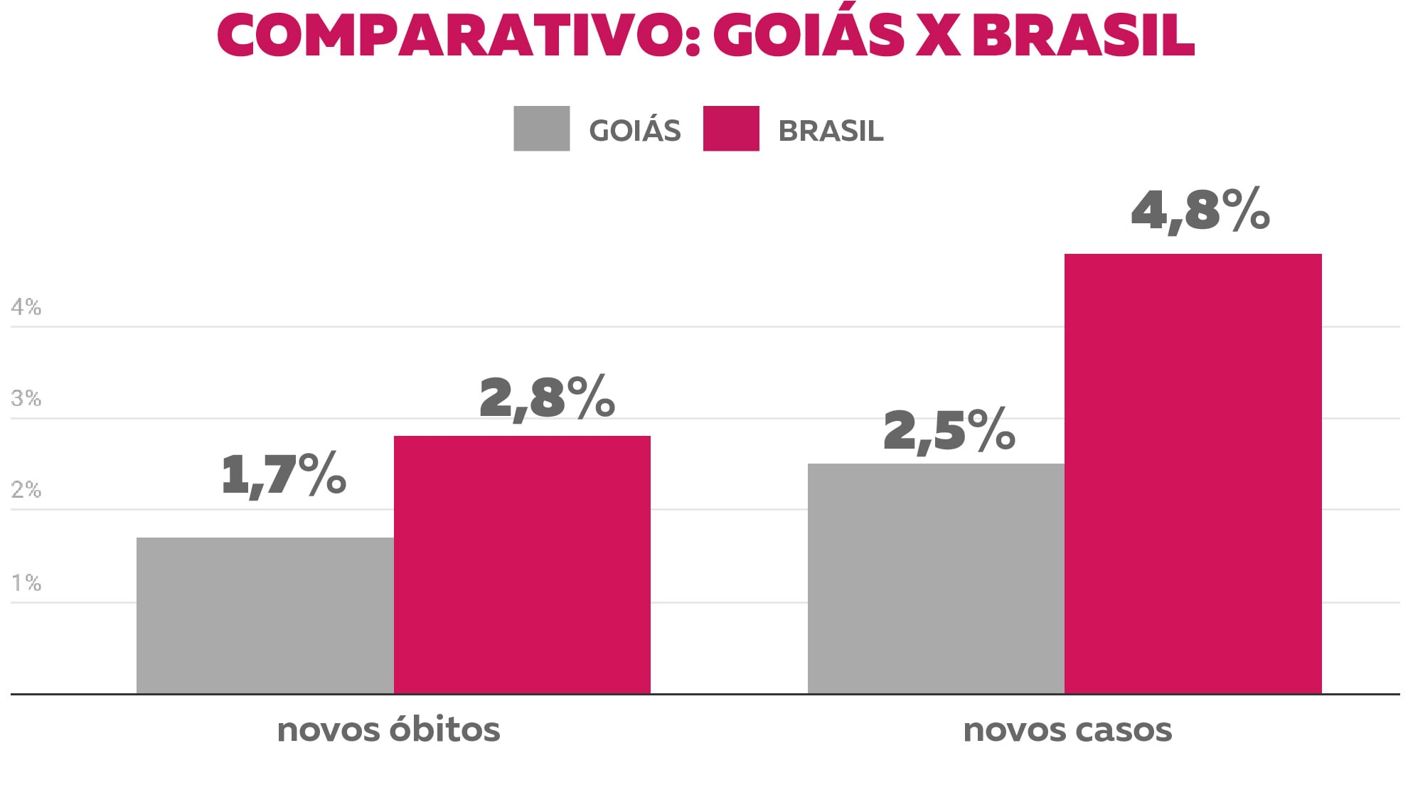 Os dados também mostram que o número de óbitos cresceu proporcionalmente abaixo da média nacional. Em todo o país, o número de mortes confirmadas pelo coronavírus subiu 2,8% no período, chegando a 184.827 mortes, de acordo com o Ministério da Saúde. Já o número de casos confirmados aumentou 4,8% e chegou a 7.110.434. A taxa de letalidade no estado de Goiás (2,3%) é menor do que a média brasileira (2,7%).