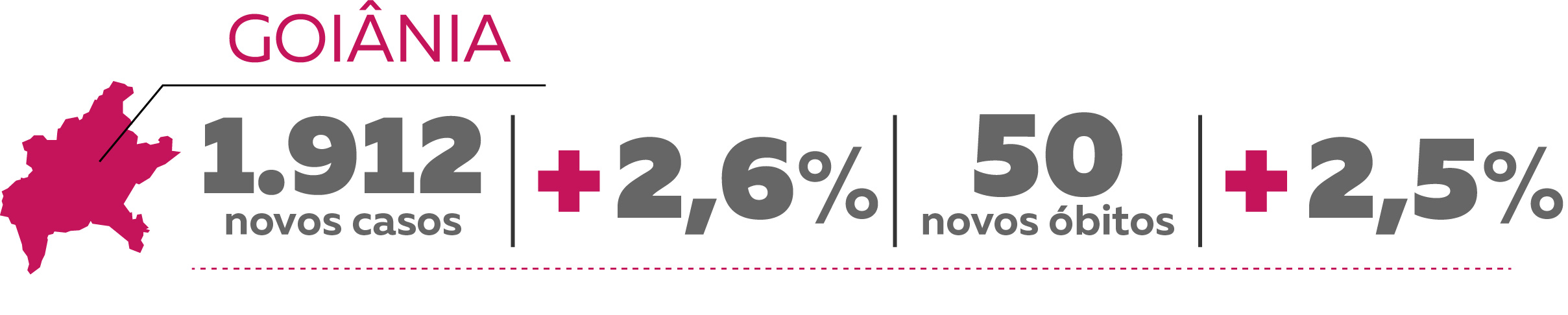 Em Goiânia foram confirmados 1.912 novos casos em uma semana, o que representa um aumento de 2,6%. Na semana anterior, o crescimento foi de 2,2%. O número de mortes na cidade saiu de 1.972 para 2.022, um acréscimo de 2,5%. Na semana passada, o aumento foi de 1,2%.