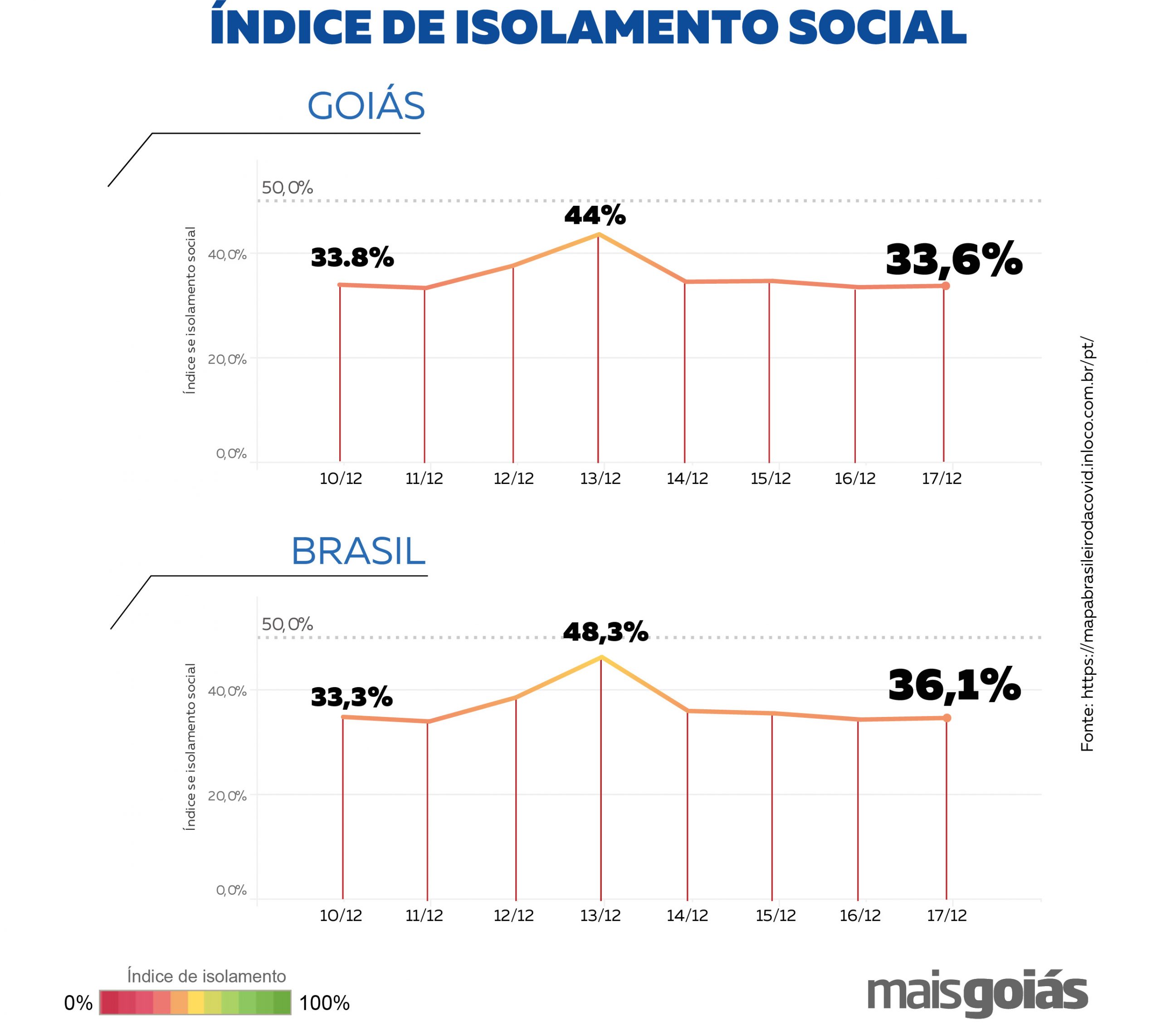 O índice de isolamento social em Goiás aumentar nesta semana, saindo de 33,8% para 33,6% de acordo com o monitoramento da empresa de georreferenciamento In Loco. O estado possui o segundo pior índice de isolamento social do País, atrás apenas do Tocantins (32,5%). A média nacional é de 36,1% e o recomendado pelas autoridades de saúde é de 70%.