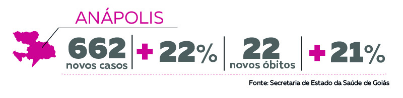 Em Anápolis foram confirmados 662 novos casos, o que representa um aumento de 22,1%. Na semana anterior, o crescimento foi de 18,8%. O número de mortes na cidade saiu de 101 para 123, um acréscimo de 21,8%.