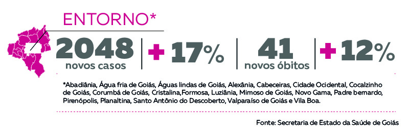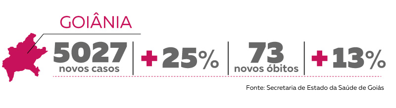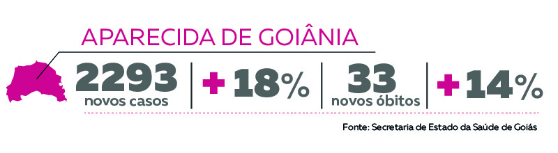 Em Aparecida de Goiânia foram confirmados 2.293 novos casos da doença em uma semana, um crescimento de 18,8%. O total de casos na capital agora é de 14.488. Foram registrados também 33 novos óbitos no município, um crescimento de 14,8%.