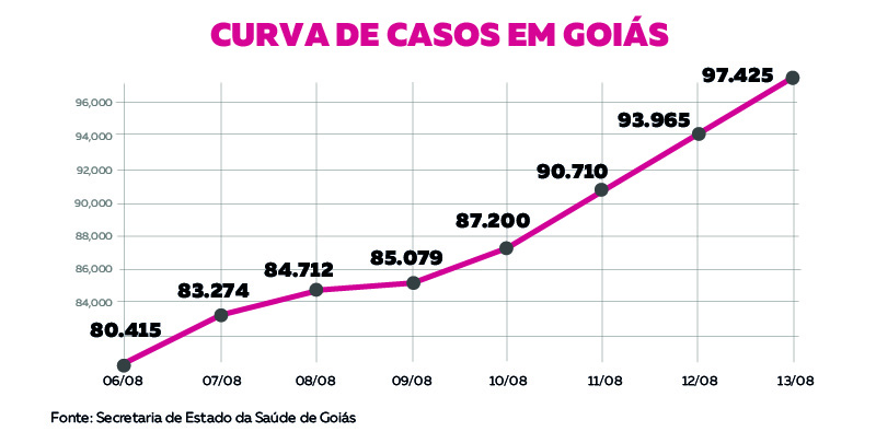 O estado de Goiás registrou 17.010 casos de coronavírus em uma semana, de acordo com os dados fornecidos pela Secretaria de Estado de Saúde (SES)*. Nesta quinta-feira (13), foram registradas 97.425 confirmações, contra 80.415 do dia 6 de agosto. O aumento no período foi de 21,2%.