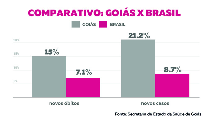 Os dados também mostram que tanto o número de casos quanto o de óbitos continuam crescendo acima da média nacional. Em todo o país, o número de casos confirmados de coronavírus subiu 8,7% no período, chegando a 3.164.785 infectados, de acordo com o Ministério da Saúde (MS). Já o número de vítimas fatais aumentou 7,1% e chegou a 104.201. Entretanto, a taxa de letalidade no estado de Goiás (2,3%) é menor do que a média brasileira (3,3%).