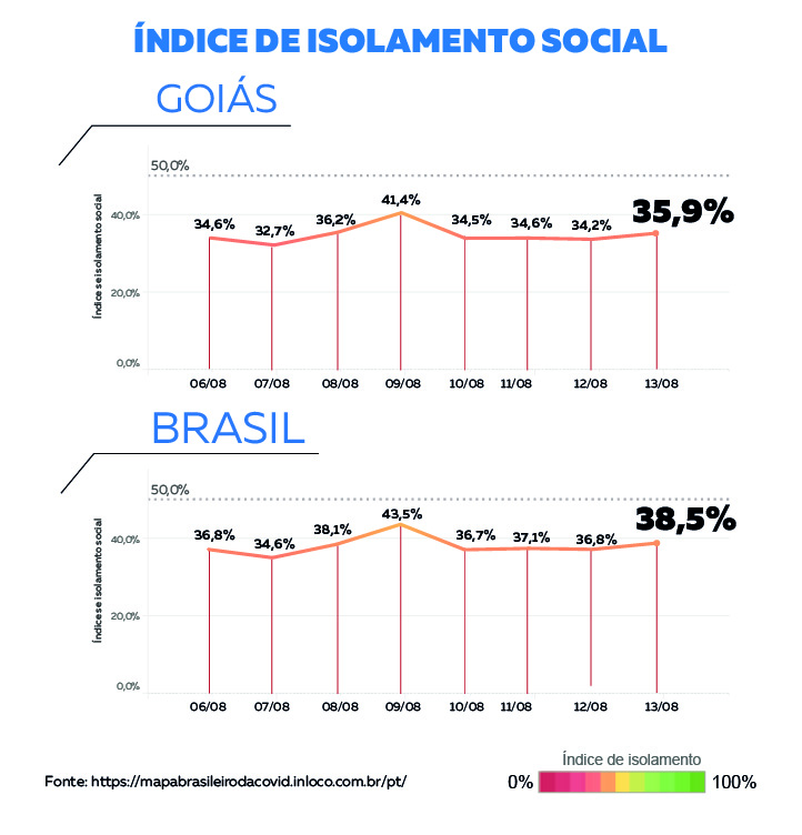 O índice de isolamento social em Goiás aumentou nesta semana, saindo de 34,6% para 35,9% de acordo com o monitoramento da empresa de georreferenciamento In Loco. O estado possui o pior índice de isolamento social do país. A média nacional é de 38,5% e o recomendado pelas autoridades de saúde é de 70%.