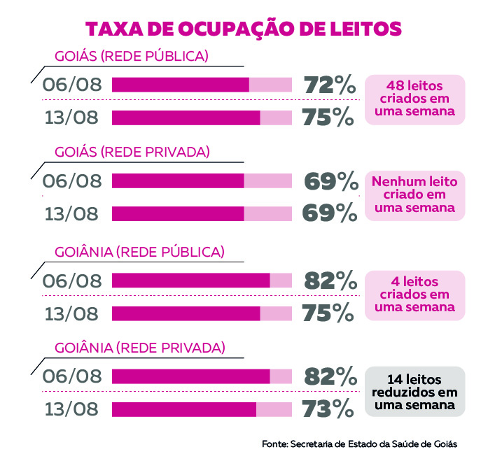 Segundo a Associação dos Hospitais Privados de Alta Complexidade do Estado de Goiás (Ahpaceg), a rede privada conta hoje com 469 leitos em todo o estado, dos quais 69,7% estão ocupados. Na semana anterior, o percentual era de 69,9%. Nenhum leito destinado aos pacientes da doença foi criado nesse período. Na semana anterior foram criados 33.