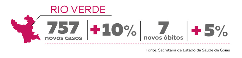 O município de Rio Verde, no Sudoeste do estado, tem o terceiro maior número de casos confirmados da doença. Até quinta (13), foram 7.730 registros de Covid-19 na cidade. Em uma semana, o crescimento foi de 10,9%. Este percentual foi maior do que o apurado na semana anterior, quando foi registrado um crescimento de 9,3%.