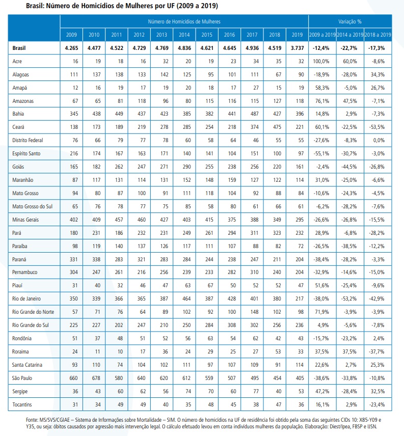 Na média nacional, segundo o levantamento, foram assassinadas 3,5 mulheres em 2019 por grupo de 100 mil habitantes e 4,3 em 2018. Redução de 17,9%.