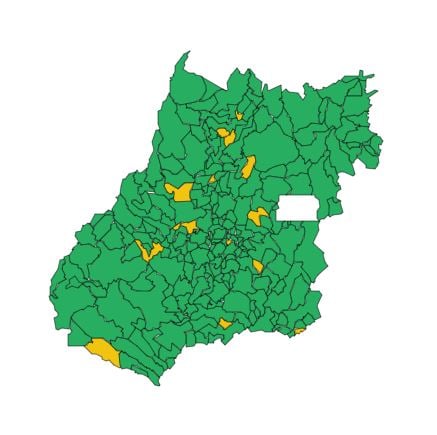 Os municípios na zona amarela de incidência de dengue (risco médio) são: Estrela do Norte, Alto Horizonte, Nova Iguaçu de Goiás, Barro Alto, Ipiranga de Goiás, Faina, Corumbá de Goiás, Mossâmedes, Ivolândia, Santo Antônio de Goiás, Panamá, Três Ranchos, Aporé, Buriti de Goiás e São Miguel do Passa Quatro.