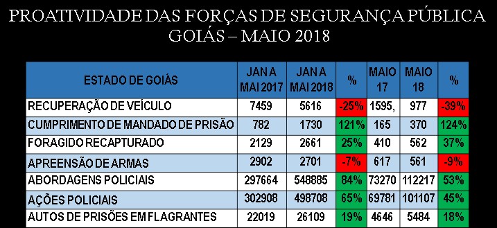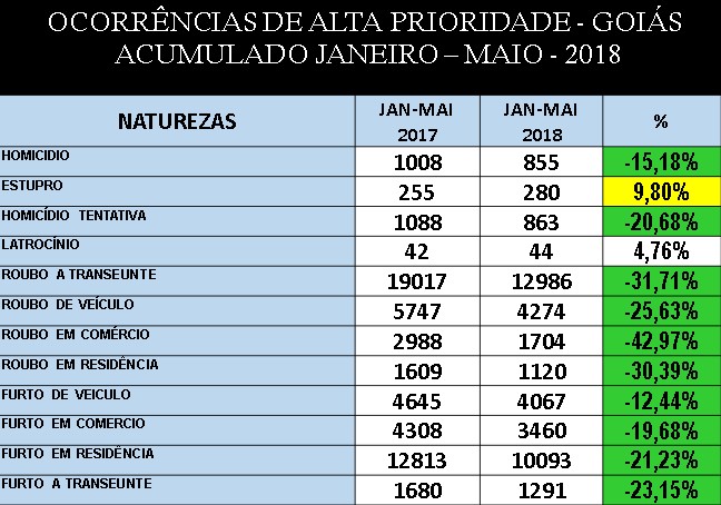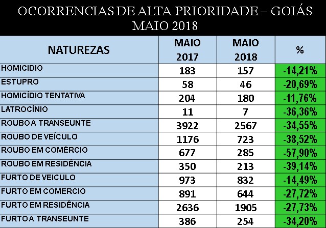Dados do observatório da Secretaria de Segurança Pública de Goiás (SSP/GO) divulgados na terça-feira (5) revelam queda de ocorrência dos 12 indicadores de criminalidade monitorados entre maio de 2017 e mesmo período deste ano no estado.