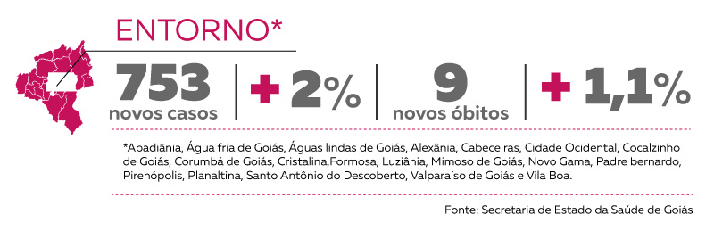 A região do Entorno de Brasília apresentou um percentual de crescimento acima da média estadual. Em uma semana, o número de casos de coronavírus saiu de 34.507 para 35.260, o que representa um aumento de 2,2%. O percentual apurado é menor do que o registrado na semana anterior, de 2,6%. Foram confirmadas também 9 mortes na semana, um crescimento 1,1%.