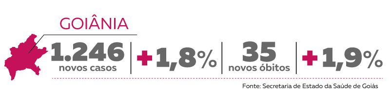 Em Goiânia foram confirmados 1.246 novos casos em uma semana, o que representa um aumento de 1,8%. Na semana anterior, o crescimento foi de 2,2%. O número de mortes na cidade saiu de 1.875 para 1.910, um acréscimo de 1,9%. O aumento foi menor do que na semana passada (7%).