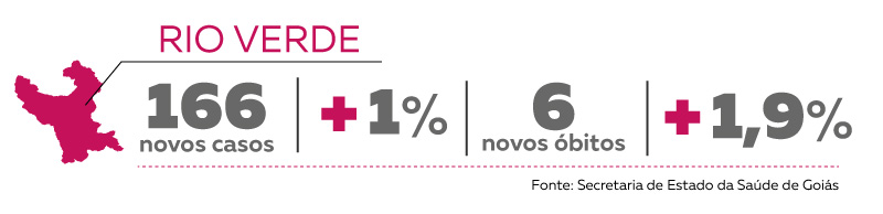 O município de Rio Verde, no Sudoeste do estado, tem o quarto maior número de casos confirmados da doença. Até quinta (19), foram 13.684 registros de Covid-19 na cidade. Em uma semana, o crescimento foi de 2%. Este percentual foi menor do que o apurado na semana anterior, quando foi registrado um crescimento de 1,3%.