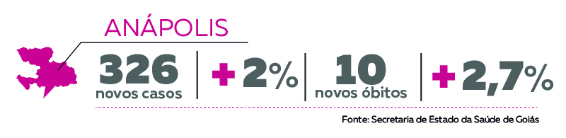 Em Anápolis, o número de casos de coronavírus na cidade saiu de 14.417 para 14.614, um crescimento de 2,6% no período. O percentual é maior do que o que foi notado no período anterior (2,3%). Foram registrados 7 óbitos no período e o crescimento foi de 1,9%. Na semana anterior o aumento foi de 2,7%.