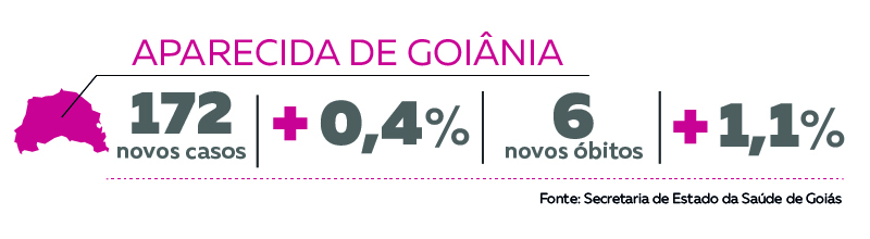 Em Aparecida de Goiânia foram confirmados 172 novos casos da doença em uma semana, um crescimento de 0,4%. Na semana passada o aumento foi de 1%. O total de casos agora é de 38.424. Foram registrados também 6 novos óbitos no município, um crescimento de 1,1%. No período anterior, o aumento foi de 2,4%