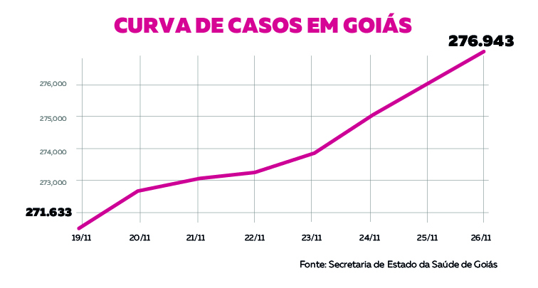 O estado de Goiás registrou 5.310 casos de coronavírus em uma semana, de acordo com os dados fornecidos pela Secretaria de Estado de Saúde (SES)*. Nesta quinta-feira (26), foram registradas 276.943 confirmações, contra 271.633 do dia 19 de novembro. O aumento no período foi de 2%.