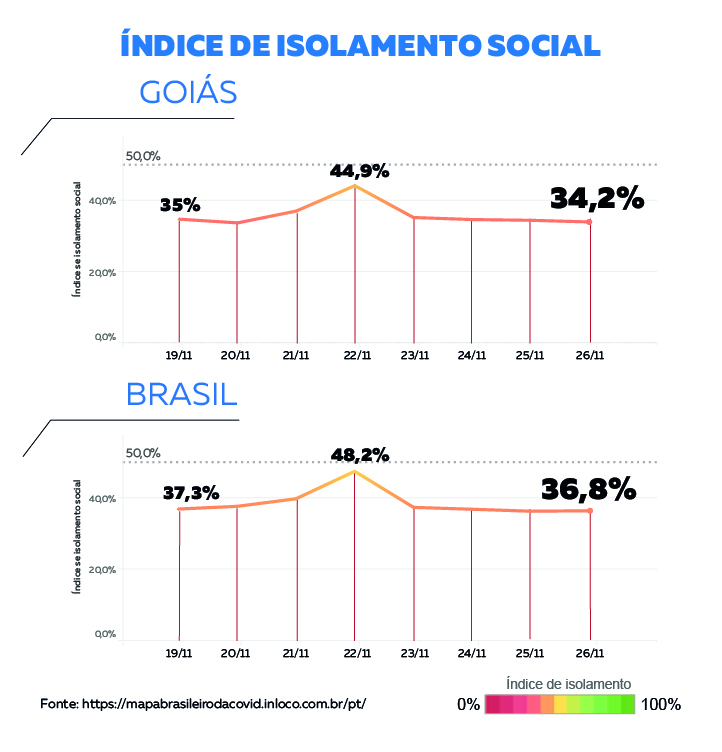 O índice de isolamento social em Goiás aumentou nesta semana, saindo de 35% para 37,2% de acordo com o monitoramento da empresa de georreferenciamento In Loco. O estado possui o pior índice de isolamento social do País. A média nacional é de 43,7% e o recomendado pelas autoridades de saúde é de 70%.