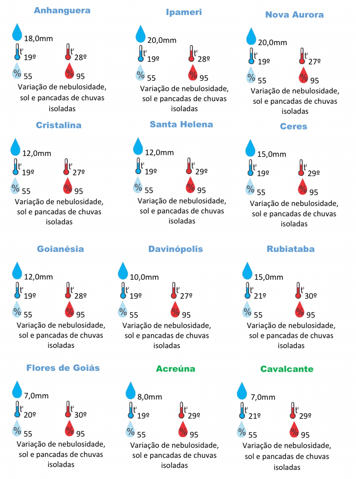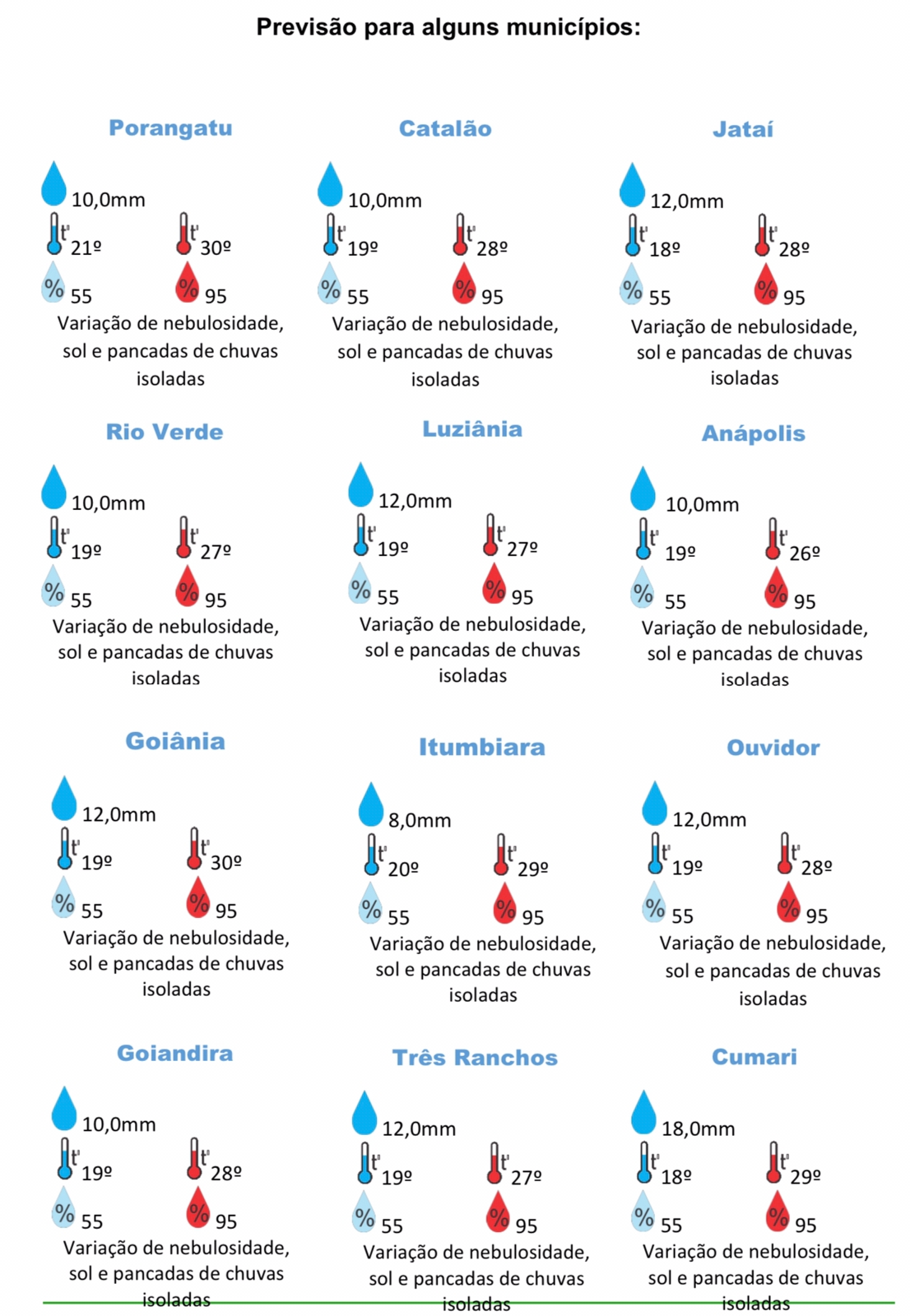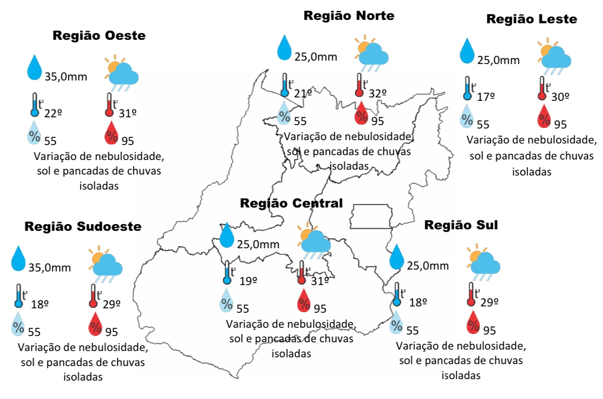 De acordo com o Cimehgo, na quinta-feira o avanço de uma frente fria pela região sudeste do Brasil, vai favorecer o aumento de nebulosidade em Goiás, o que pode ocasionar áreas de instabilidade, com chuvas volumosas, acompanhadas de rajadas de vento e raios.