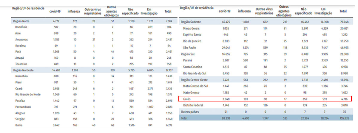 A tabela também informa os óbitos em decorrência da Covid-19 por região. Até a oitava semana, a região Centro-Oeste registrou 1.952 mortes.