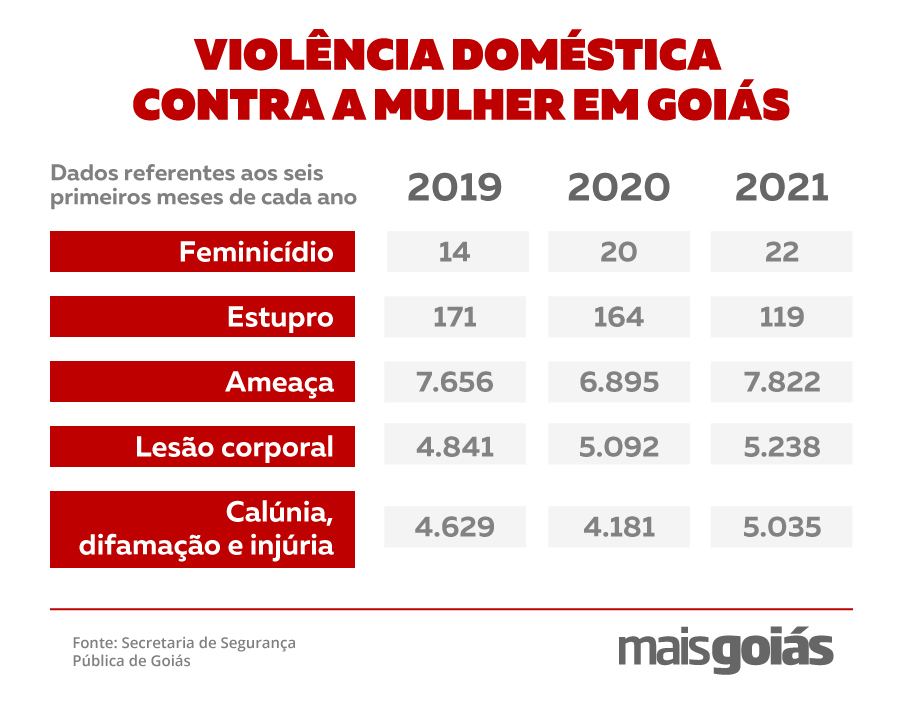 Conforme dados da Secretaria de Segurança Pública de Goiás (SSP-GO), somente no mês de janeiro de 2021, 995 mulheres foram vítimas de lesão corporal. Os índices de agressão também foram altos nos demais meses do 1º semestre do ano: foram 784 registros em fevereiro; 786 em março e 872 em abril. Maio e junho registraram 984 e 817 crimes deste tipo, respectivamente.