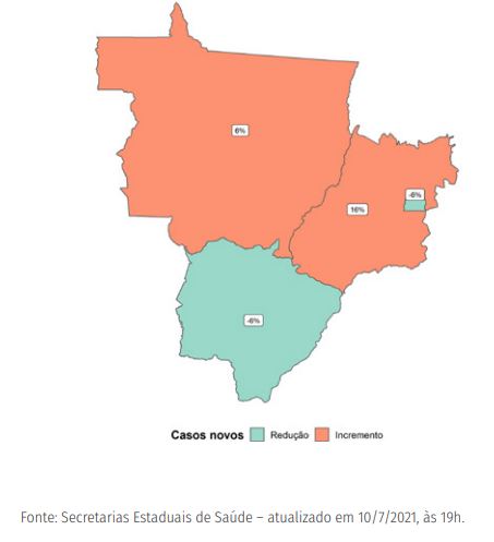 De acordo com o boletim do Ministério, no conjunto das UF da região Centro-Oeste, “observa-se um aumento de 6% no número de casos novos da SE 27 (32.009) em relação à SE 26 (30.192), com uma média diária de 4.573 casos novos na SE 27, frente a 4.313 na SE 26”.