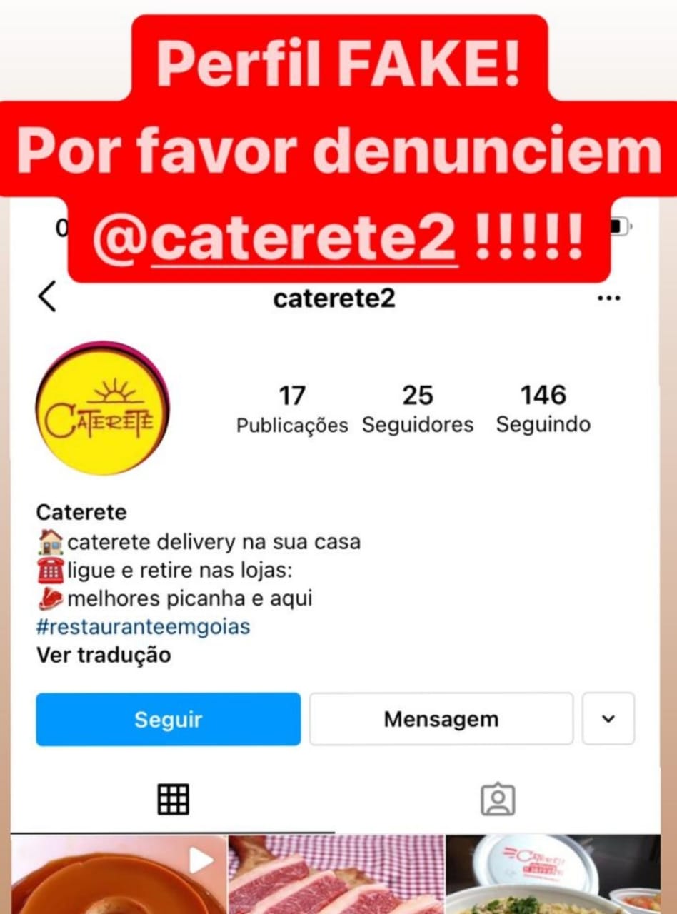 Ao Mais Goiás, o proprietário do Cateretê Bar e Restaurante, Emerson Tokarski, relatou o problema. O empresário afirma que, nos últimos tempos, tem identificado até dois perfis falsos por semana, se passando por seu estabelecimento. “Eles dizem que a pessoa ganhou um prato, um voucher, que você tem que passar o código SMS. Daí, clonam o Whatsapp. É um velho golpe”, diz Tokarski.