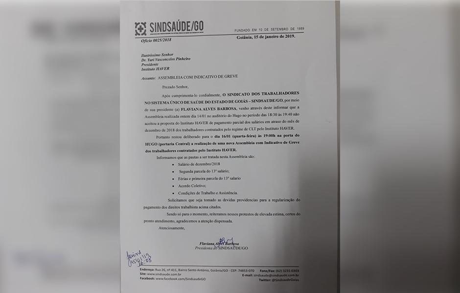 O Sindicato dos Trabalhadores do Sistema Único de Saúde no Estado de Goiás – Sindsaúde/GO esteve presente na movimentação dos funcionários e encaminhou uma notificação nesta terça-feira (15) para o Instituto Haver. No documento, eles comunicam as reinvindicações e as pautas dos trabalhadores.
