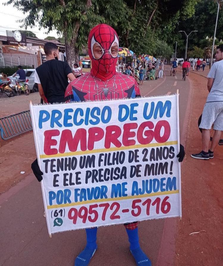 Frustrado com o golpe do qual foi vítima, Ailton foi para as ruas vestido do famoso personagem da Marvel na tentativa de conseguir outra oportunidade. A intenção inicial era somente chamar atenção com a fantasia e a placa, mas o rapaz resolveu levar o pedido de ajuda para outro nível, escalando o viaduto. “Eu nem sabia que ele ia fazer isso. Foi no desespero mesmo”, revela Valesca, que disse que o marido chegou a ser levado para a delegacia de Polícia por conta do ato perigoso, mas foi liberado.