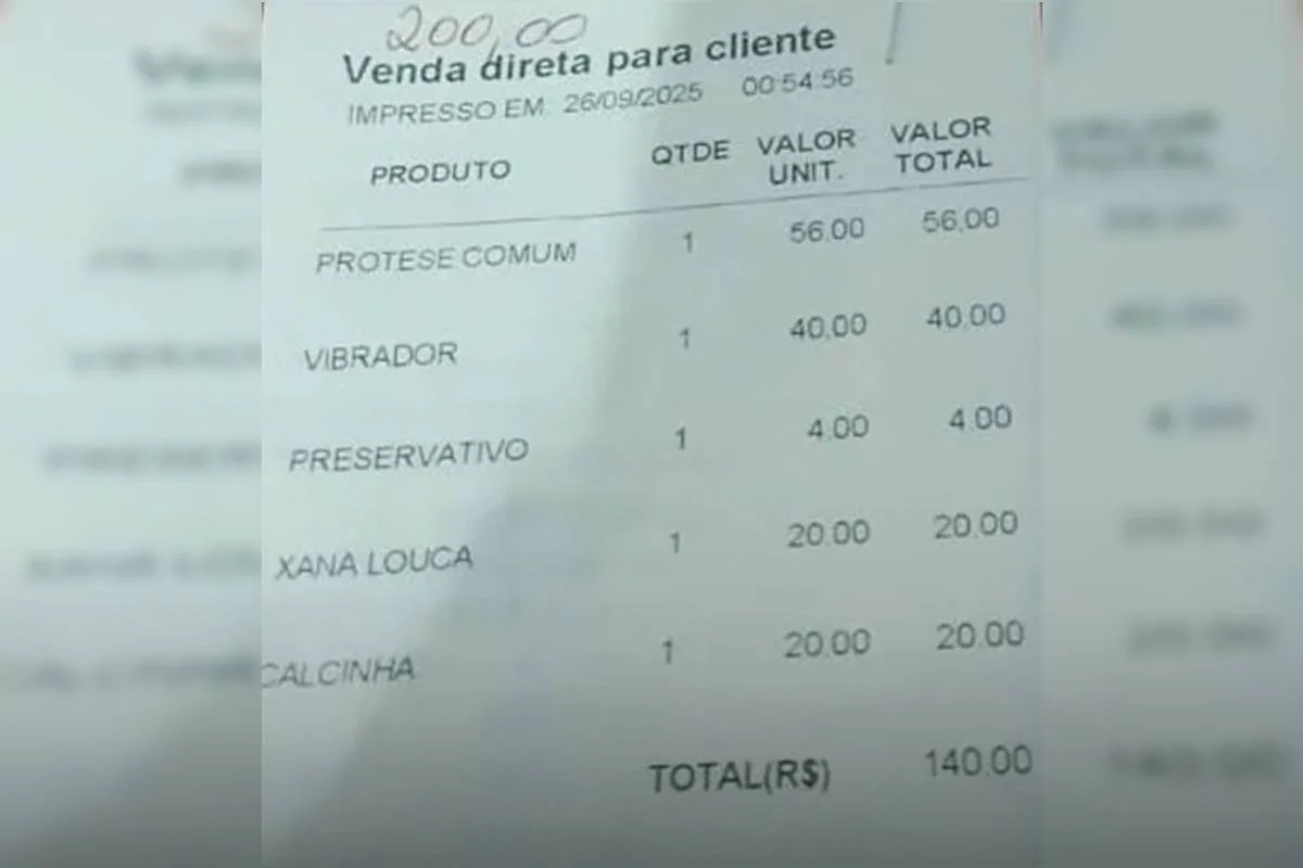 Na comanda constavam itens utilizados pelo cliente, entre eles um vibrador, uma calcinha, preservativos e um gel lubrificante conhecido popularmente como “xana louca”.