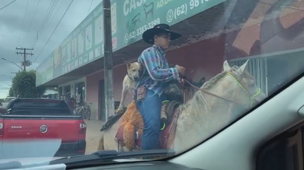 Um homem, identificado como Marcos Felipe Rodrigues, chamou atenção após levar o próprio cachorro para passear a cavalo pelas ruas de Alto Horizonte de Goiás. Um vídeo mostra o cão sentado logo atrás do cavaleiro.