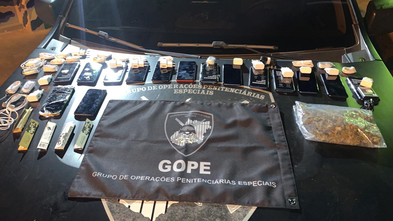 Com o homem, a equipe encontrou uma mochila com 15 celulares, 15 carregadores para os eletrônicos, 17 fones de ouvido, 8 chips de operadoras, uma bateria para celular, além de 14 porções de substâncias análogas à maconha e à cocaína. Os materiais e o suspeito foram encaminhados à Delegacia.