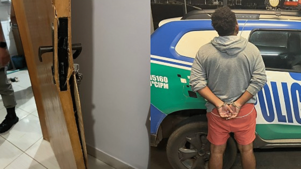 Ainda dentro do quarto, a jovem acionou a polícia e os agentes encontraram o rapaz na entrada da residência. Ele recebeu voz de prisão, tentou atacar a equipe policial, mas foi contido com o uso moderado da força e algemado.
