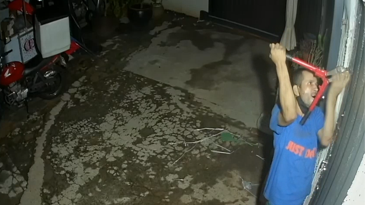 De acordo com o depoimento da vítima à polícia, o suspeito entrou em um lote baldio que fica nos fundos da loja e conseguiu entrar no depósito. As imagens da câmera de segurança mostram que ele quebra os cadeados de uma porta e tenta arromba-la, mas não consegue.