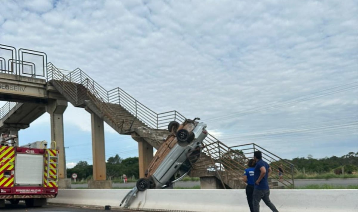 De acordo com o Corpo de Bombeiros, o motorista perdeu o controle do veículo e acabou atingindo a mureta de proteção da pista. O impacto foi tão forte que o carro avançou sobre uma passarela de pedestres e ficou pendurado.
