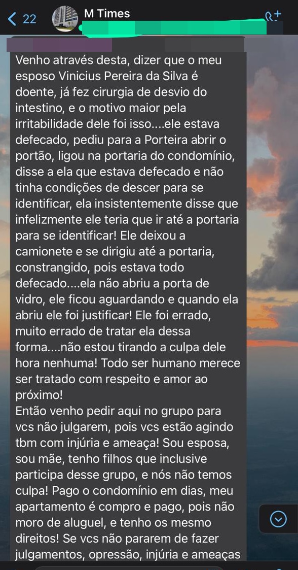 No texto, a mulher pede para que os moradores do prédio não julguem Vinícius. “Vocês estão agindo também com injúria e ameaça. Sou esposa, sou mãe, tenho filhos que inclusive participam desse grupo e nós não temos culpa! Pago o condomínio em dias, meu apartamento é comprado e pago, pois não moro de aluguel e tenho os mesmo direitos!