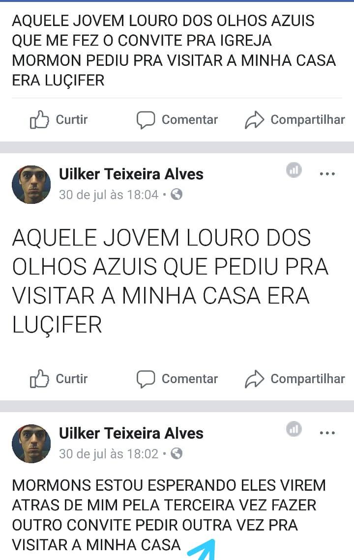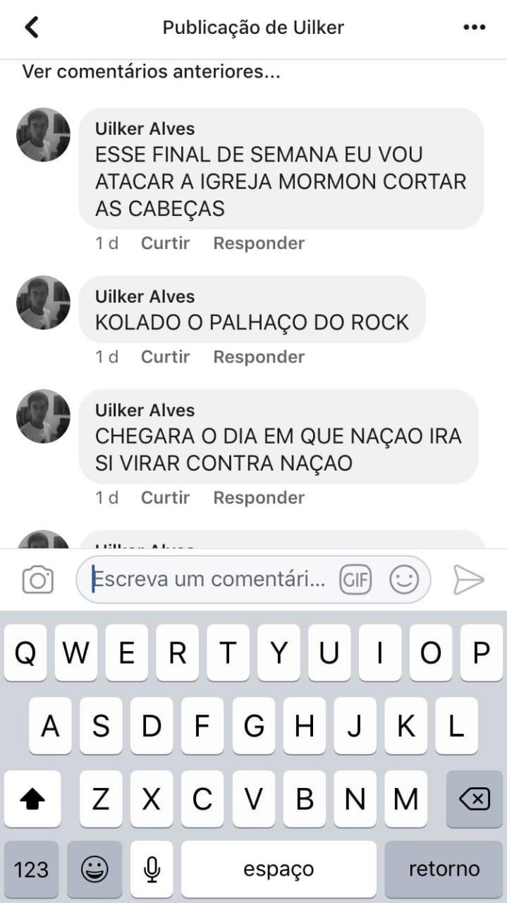 Segundo informações do aspirante Luís Alexandre, o agressor já havia feito ameaças à igreja em sua página no Facebook. “Ele não diz nada que faça sentido, é uma pessoa transtornada. No Facebook, por exemplo, ele diz que recebeu uma visita de Lúcifer e que Lúcifer mandou ele esfaquear pessoas dessa igreja”, contou.